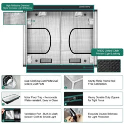 This 3ft x 3ft x 6ft Indoor Grow Tent provides a stable environment for easy control of light and temperature for your indoor grow project. This tent blocks all light from escaping and is lined with 100% reflective mylar to boost the output efficiency of any grow tent setup. It includes sturdy steel bars for adding fans, lights, and filters. Easy, tool-free assembly.