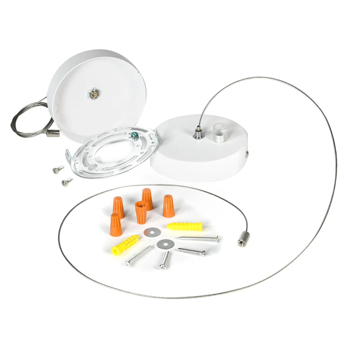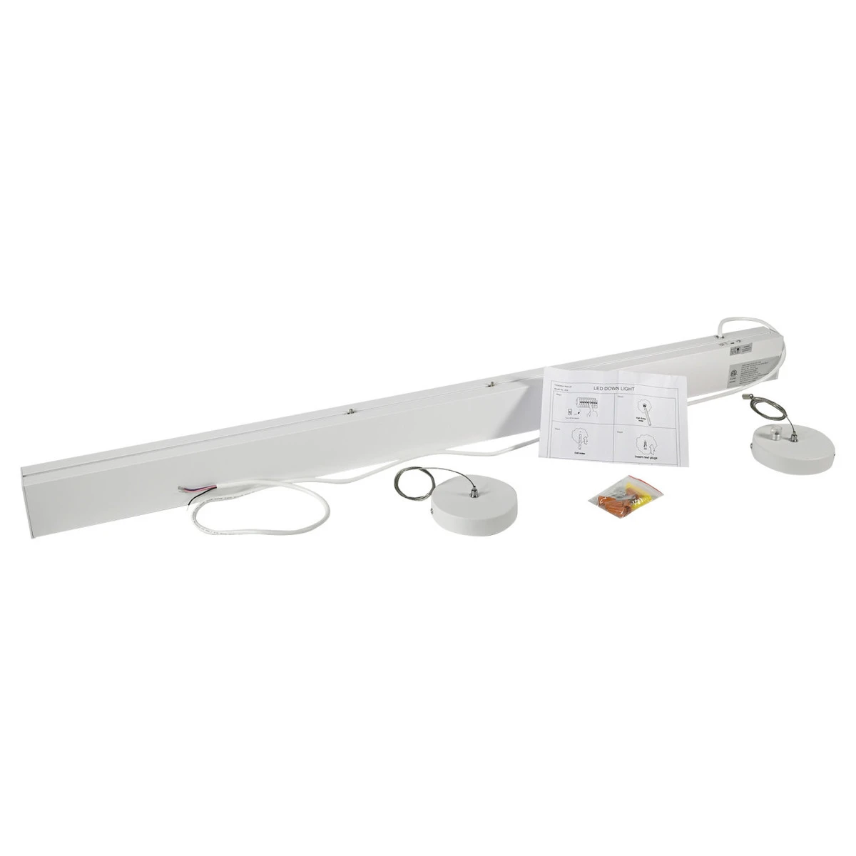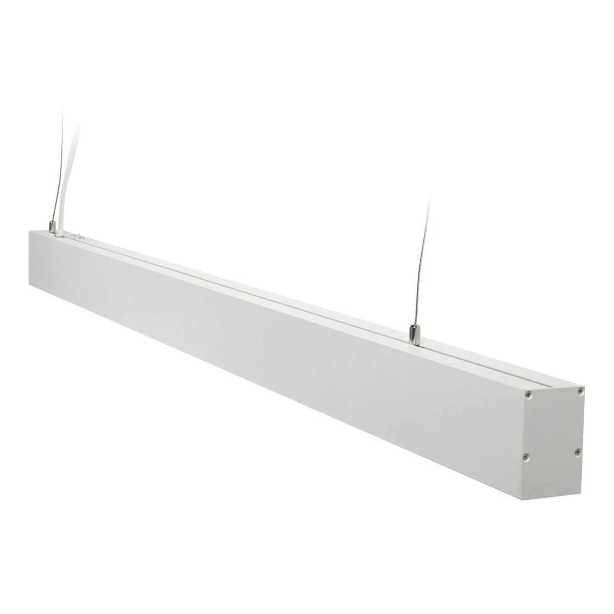 This LED strip light is constructed of aluminum housing with powder coated white finish. Installs suspended via cable or chain (chain sold separately). It has a square polycarbonate frosted shatterproof lens. It includes a 0-10V dimmable driver (0-10V dimmer sold separately).