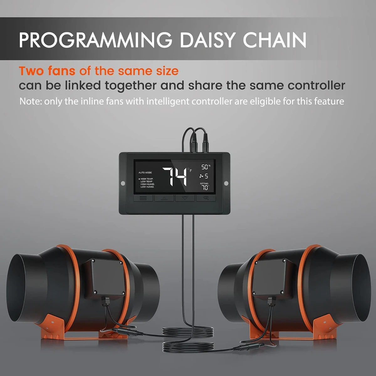 - One controller can link two 6″ exhaust fans. They can be programmed the same and controlled at the same time