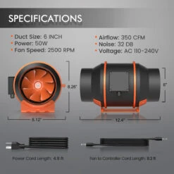 This 6-inch speed & humidity controlled inline duct fan boasts the following: