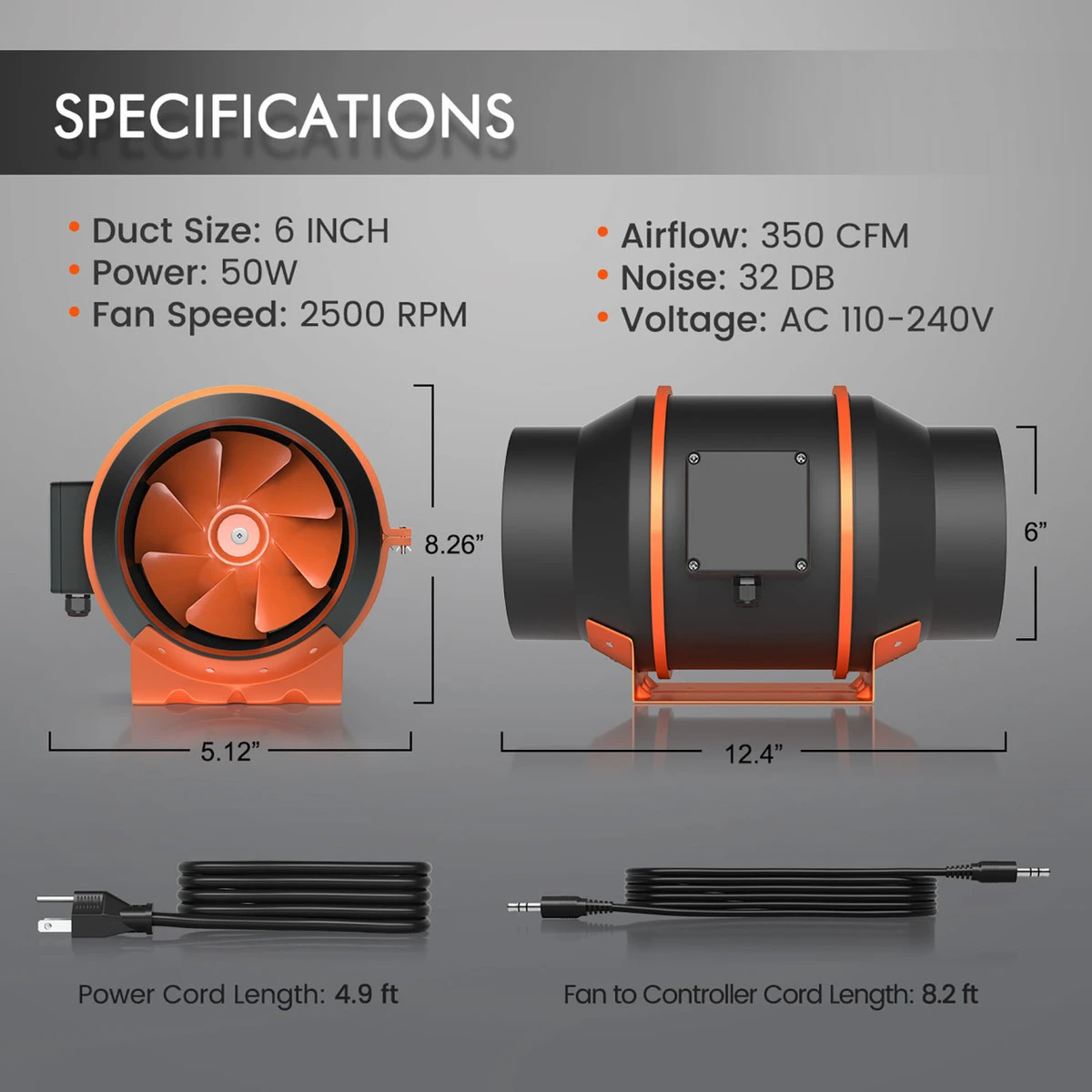 Dimensions: L 12.4″ x W 5.12″ x H (of entire fan) 8.26″ (Duct Size is 6″)