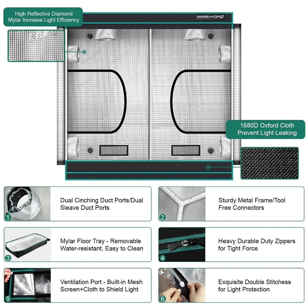 The interior of this tent is made of highly reflective diamond mylar to maximize the amount of light hitting the plants and minimize light leaks. The exterior is high-quality 1680D double-stitched canvas providing a tear-proof design. It utilizes an all metal frame that can support up to 330 lbs.