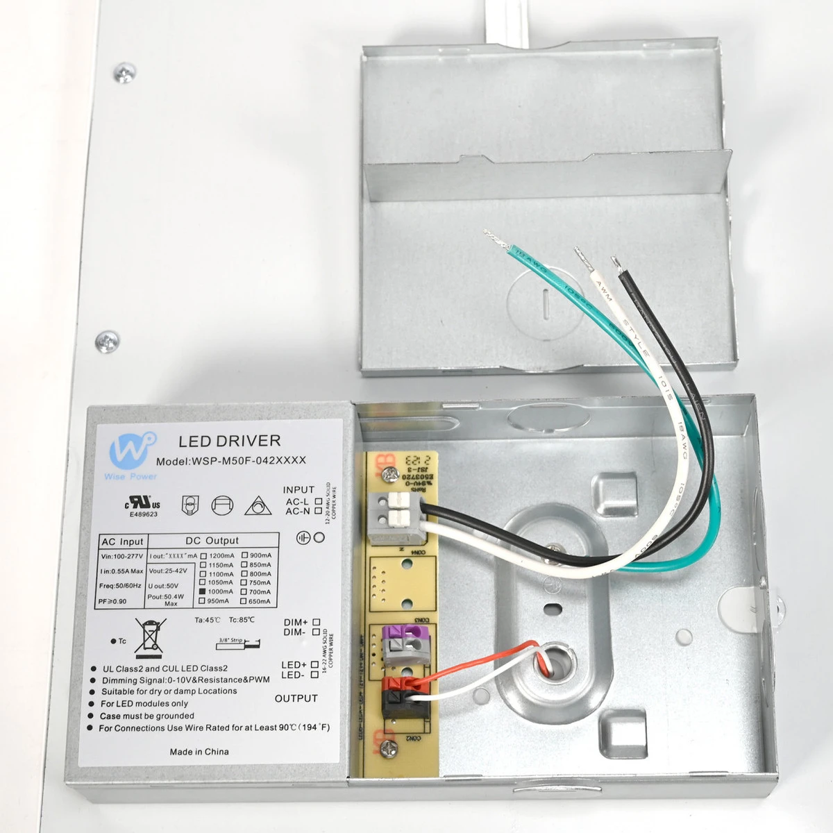 This LED panel light is 40W at 125 lumens per watt produces 3500 lumens. It come standard with a LED dimmable driver with a 0-10V dimmer. It comes in flicker-free 4000K & 5000K color temperature.