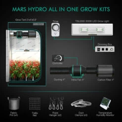 Take the guesswork out of selecting the best equipment for your plant grow light and tent setup with this LED Full Spectrum Grow Light and 2ft x 4ft Tent Kit from Mars Hydro! Each complete grow light kit includes everything needed to start off your grow project including the LED full spectrum grow light with the tent that works best with the light, ventilation fan and ducting, timer, hygrometer, grow bags, and light hangers.