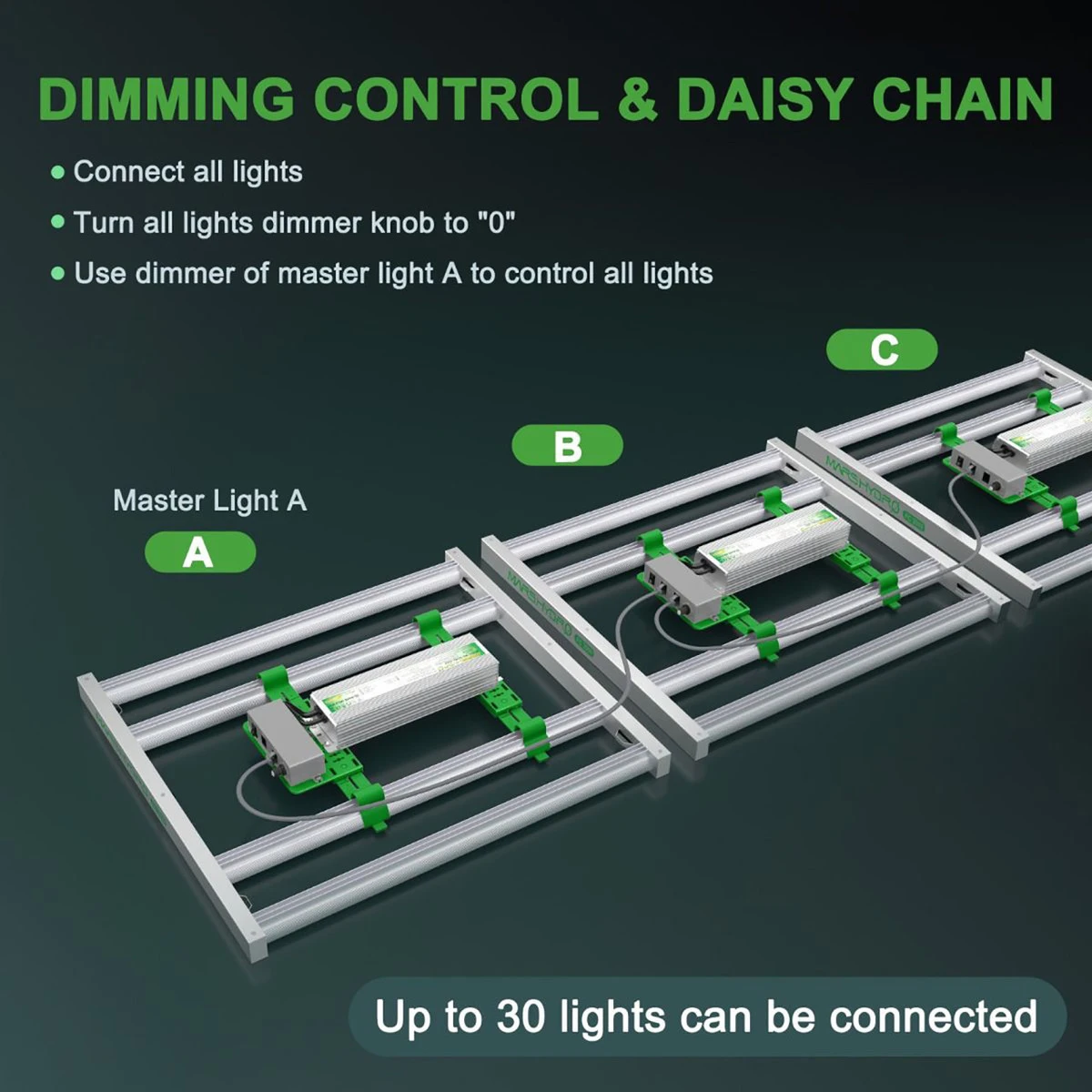 Simple dimming function and master light controller allow you to conveniently link and control up to 30 FC-3000 lights from one light driver making this commercial-cultivator’s preferred light solution for single or multi-tier racking and indoor shorter plant grow scenarios. The removable driver allows the user to place the driver in an easy-to-reach location and to reduce heat buildup around the light.