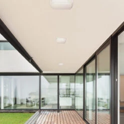 Made for outside applications, this light is composed of die-cast aluminum housing with a corrosion resistant powder-coated white paint finish. It is fade, weather, and abrasion resistant to last for up to 50,000 hours. Its lens is a frosted, glare-free glass lens to provide an even distribution of light.