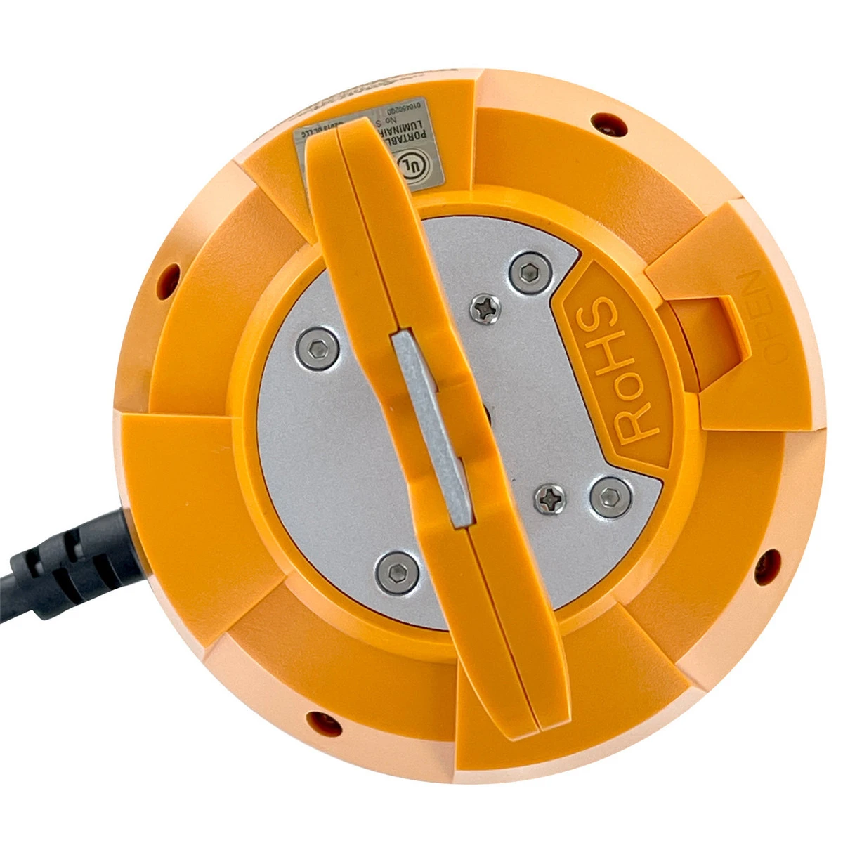 This light has an M8 screw hole on the top allowing it to be attached to a tripod mount (sold separately), eyebolt (sold separately) for suspension hanging, or a retractable handle (included) for portability as a free-standing light. The light also has a built-in grounded outlet with cover allowing you to daisy chain additional lights. It is equipped with a smart fuse that safely resets if the outlet is overloaded more than 5A. Each light comes with a pre-installed, heavy-duty 6′ grounded power cord suitable for AC120V.