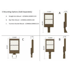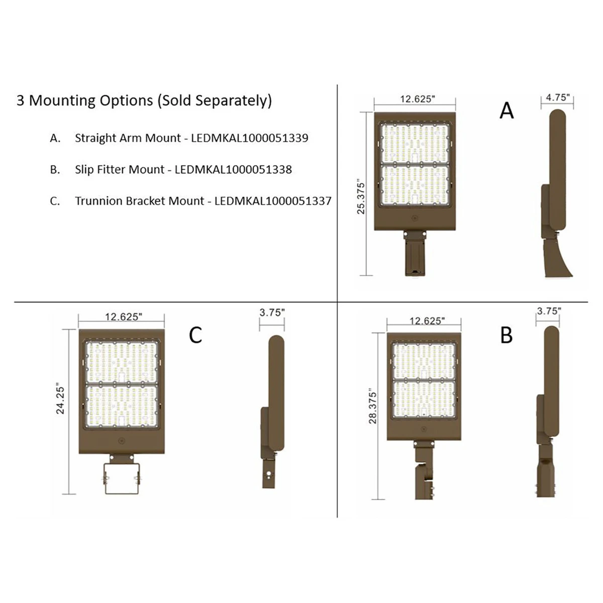 Three different mounting brackets are available for purchasing separately – Straight Arm Fixed Mount (LEDMKAL1000051339), Slip Fitter Pole Mount (LEDMKAL1000051338), and Adjustable Trunnion Bracket Mount (LEDLHLS1000051337). Twist-Lock photocell is also available as SKU LEDLHLS1000050699.