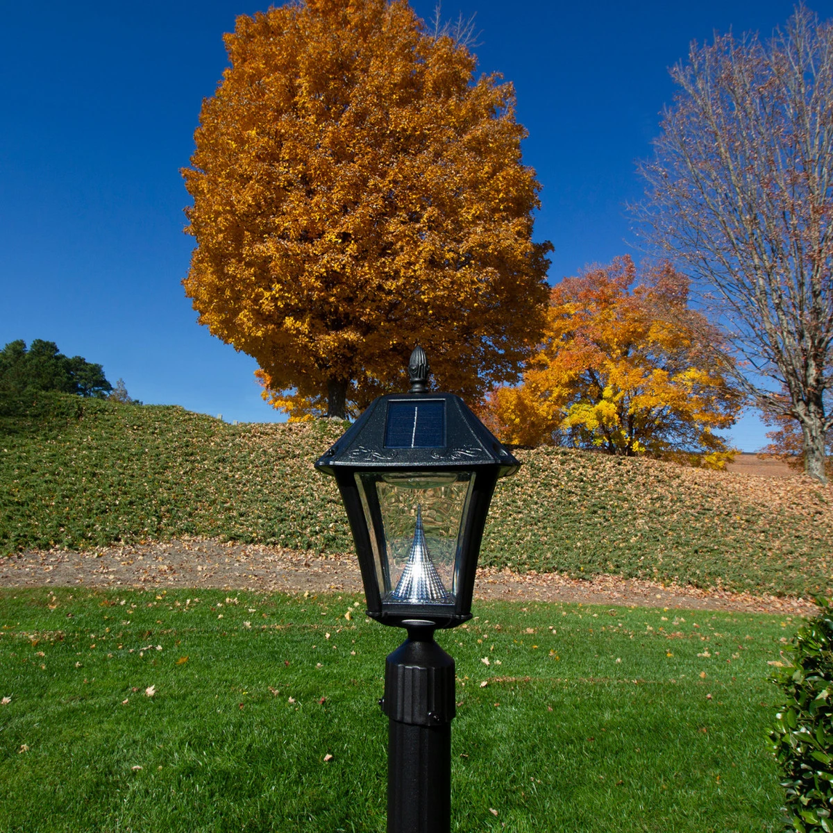 The Gama Sonic Baytown II Solar LED outdoor light fixture is an energy-saving and money-saving replacement for electric or gas-powered outdoor lighting. This solar lantern makes a stylish addition to your home’s exterior. This solar lamp comes with 10 LEDs and Gama Sonic’s cone reflector which helps disperse the light more efficiently. The Wall/Pier/3″ Fitter Mounts selection comes with three different mounting options and can be placed on any 3-inch outside diameter pole, 3-inch pier/flat base or mounted to the wall. The Lamp Post (Included) selection includes an EZ Anchor lamp post.